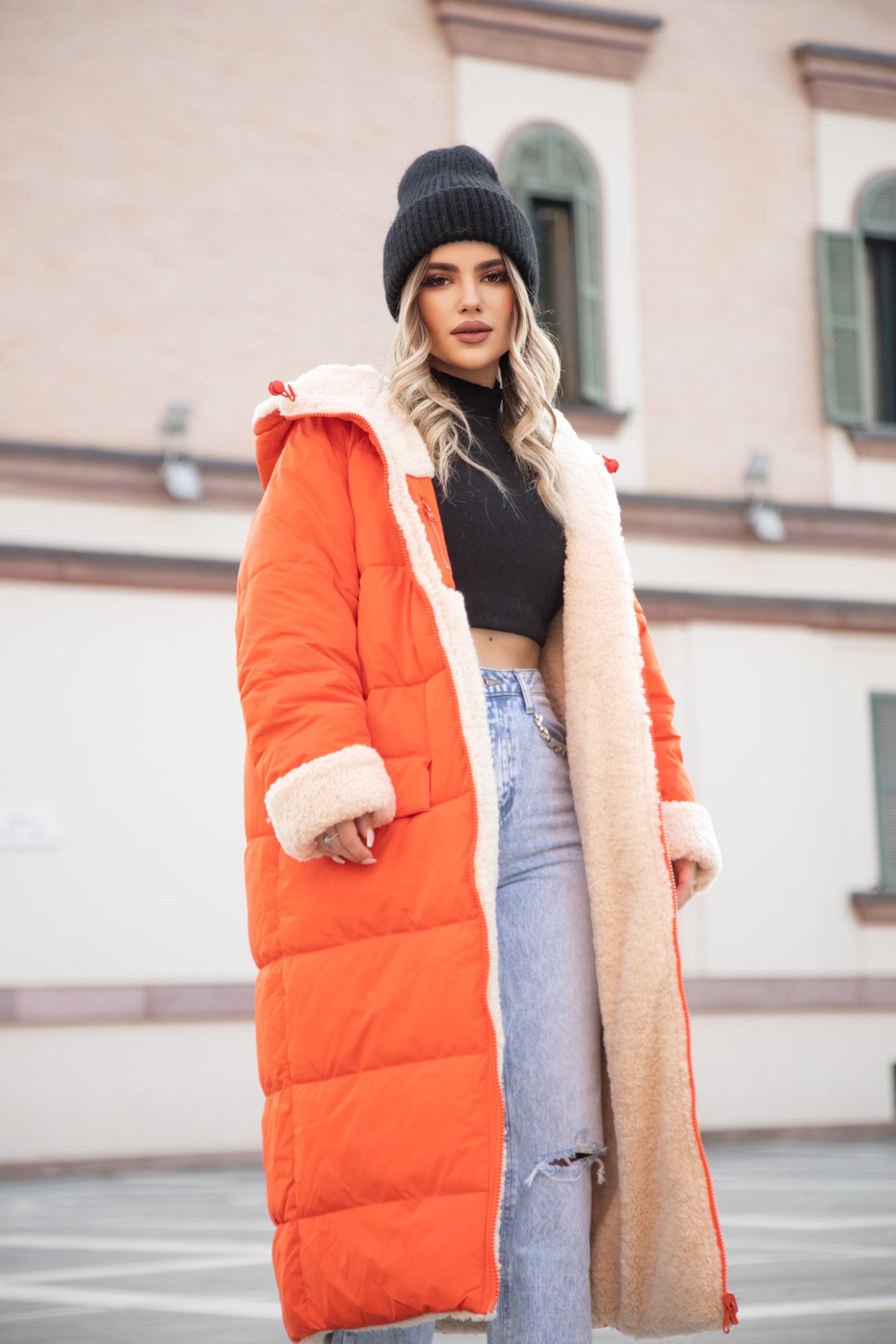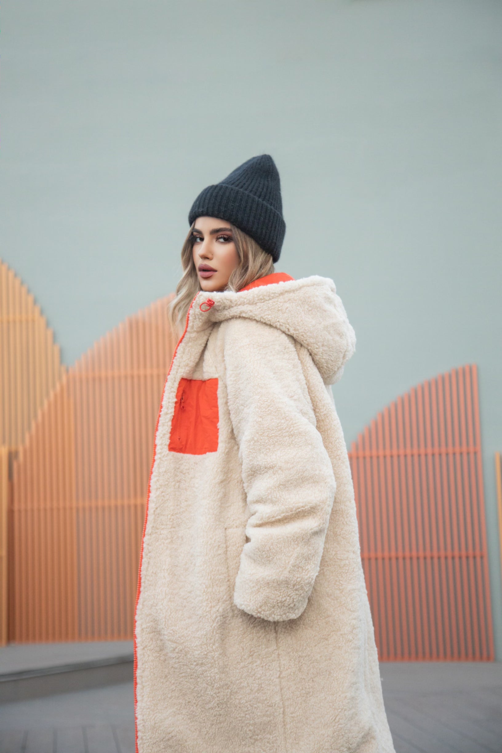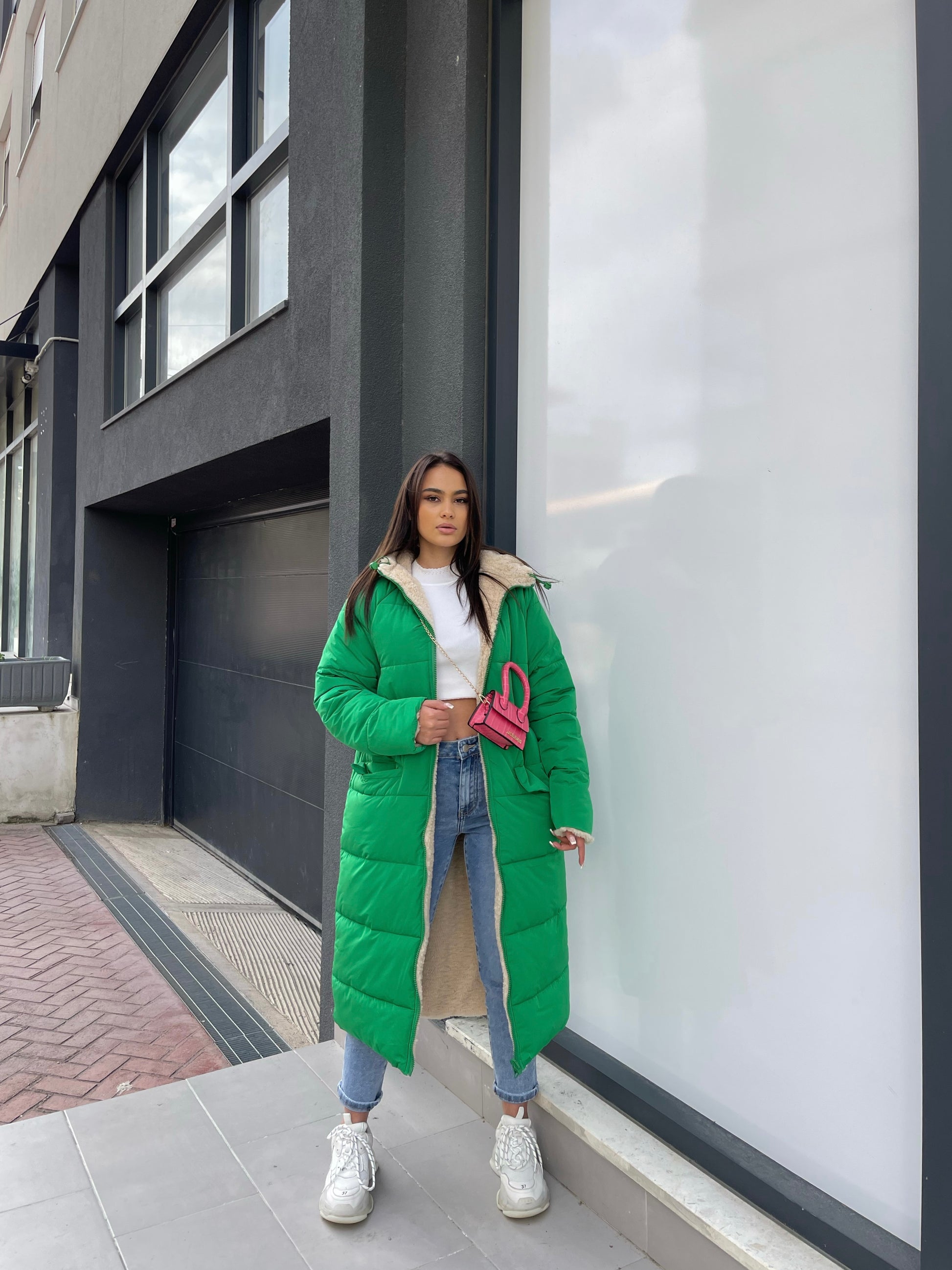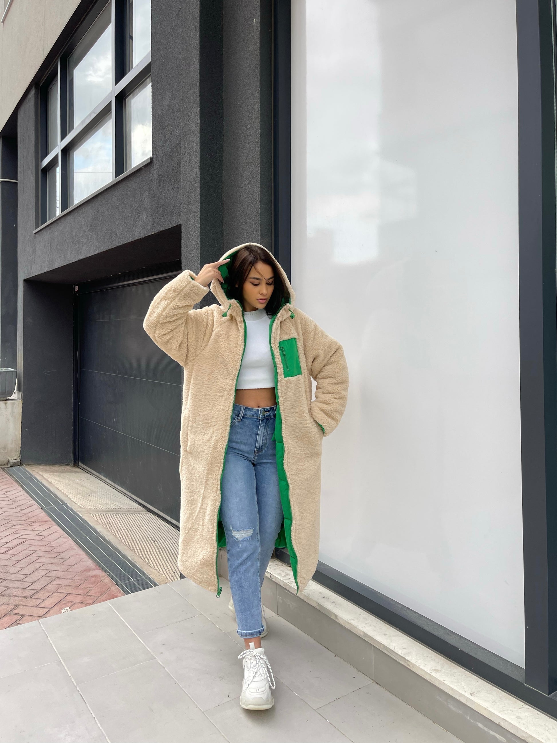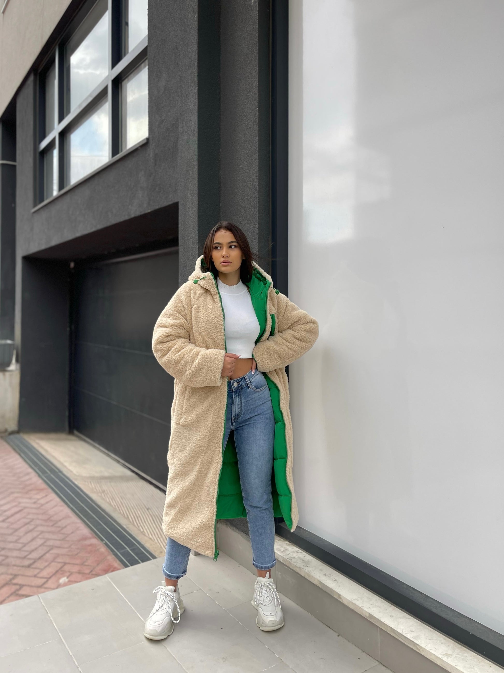 Xhup pellush i gjate me menge te gjata. Me xhepa pllak ne pjesen e perparme. Xhupi vishet nga te dyja anet. Me kapuc te bollshem dhe llastik ne pjesen e kapucit. Teper komod dhe i rehatshem.