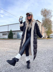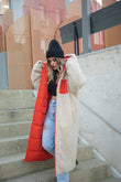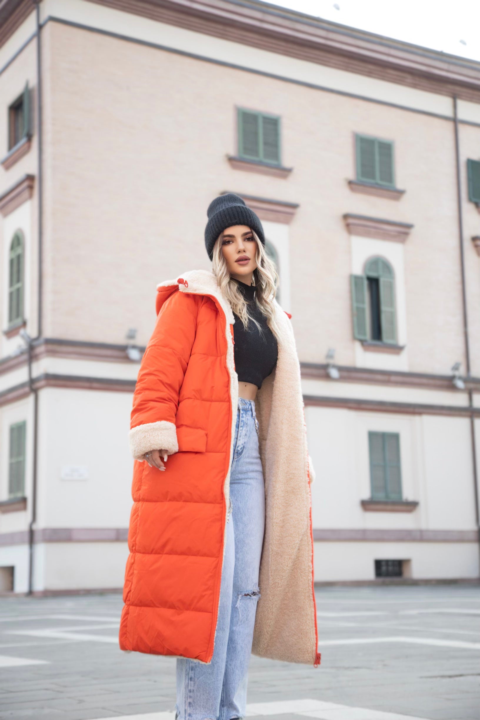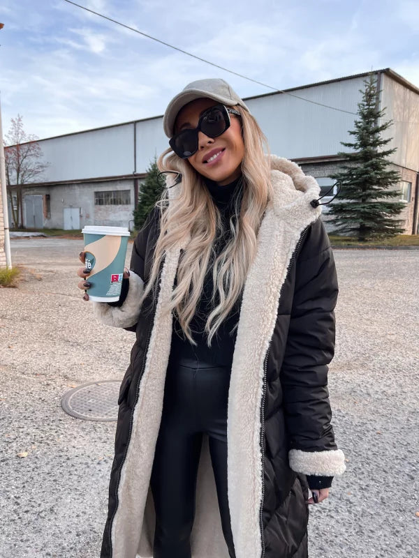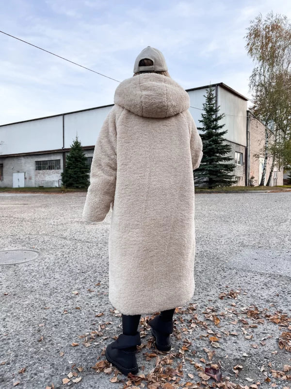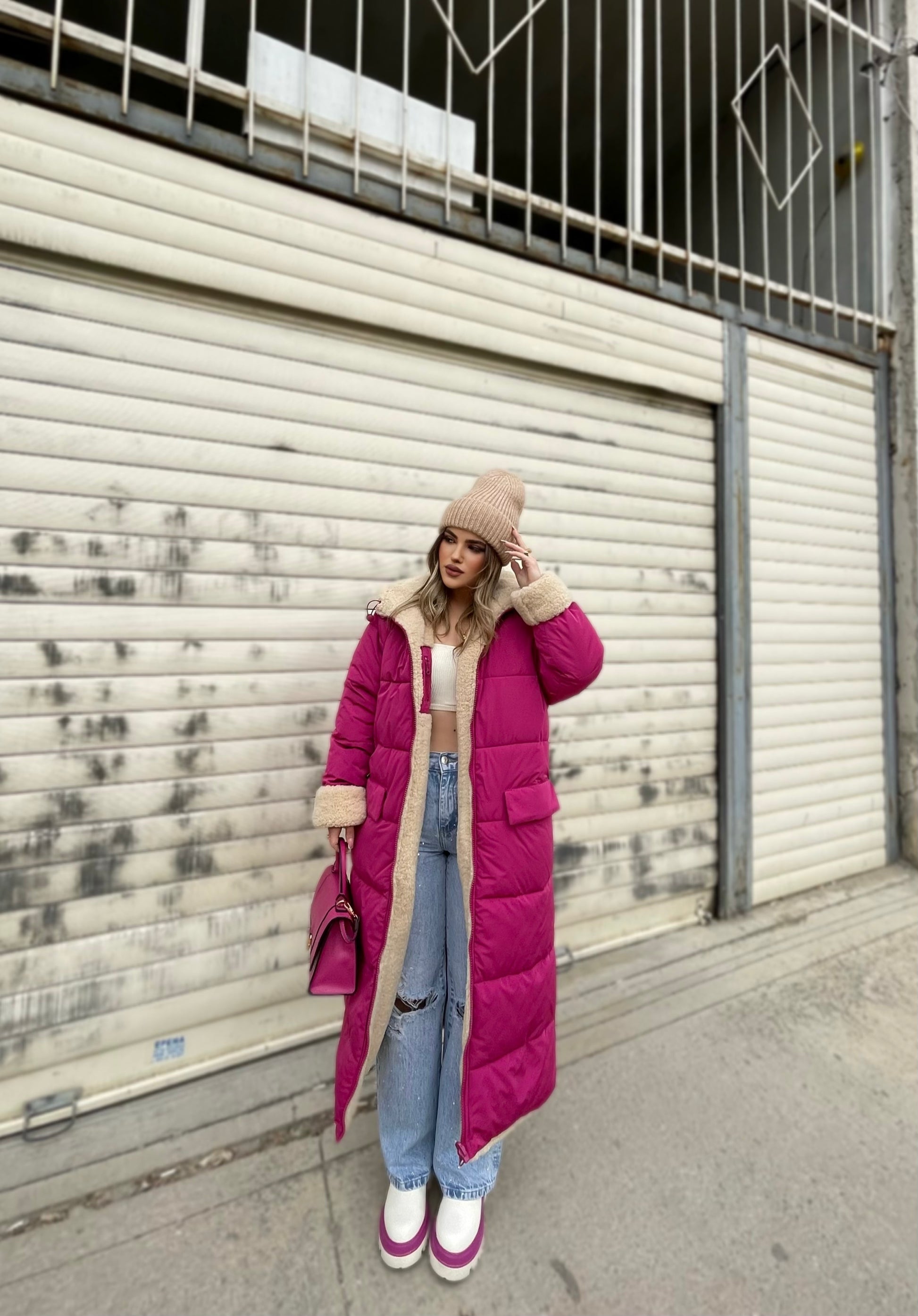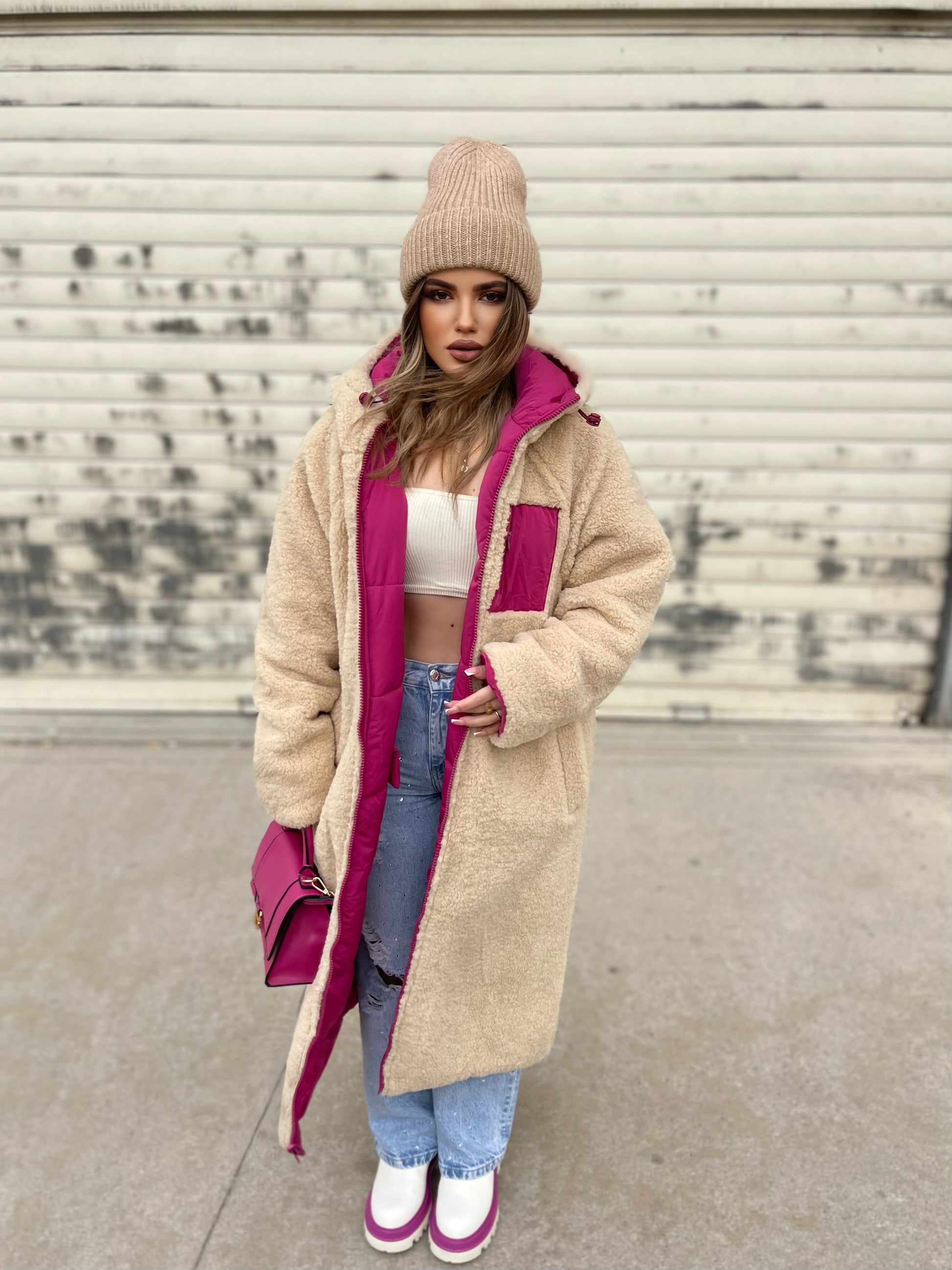 Xhup pellush i gjate me menge te gjata. Me xhepa pllak ne pjesen e perparme. Xhupi vishet nga te dyja anet. Me kapuc te bollshem dhe llastik ne pjesen e kapucit. Teper komod dhe i rehatshem.