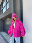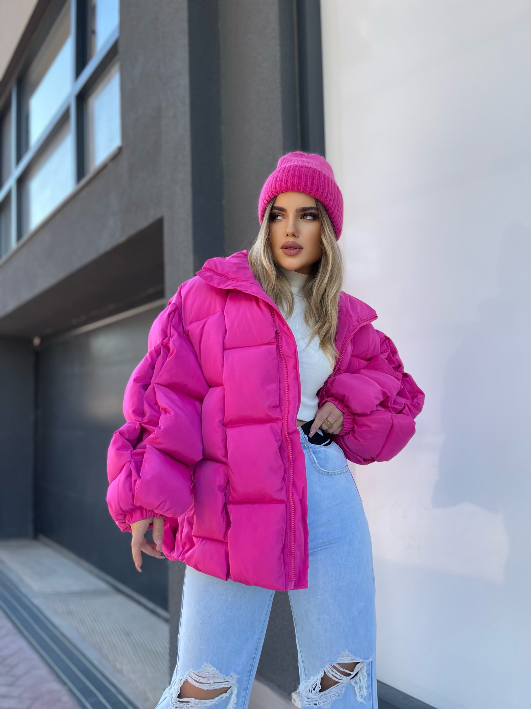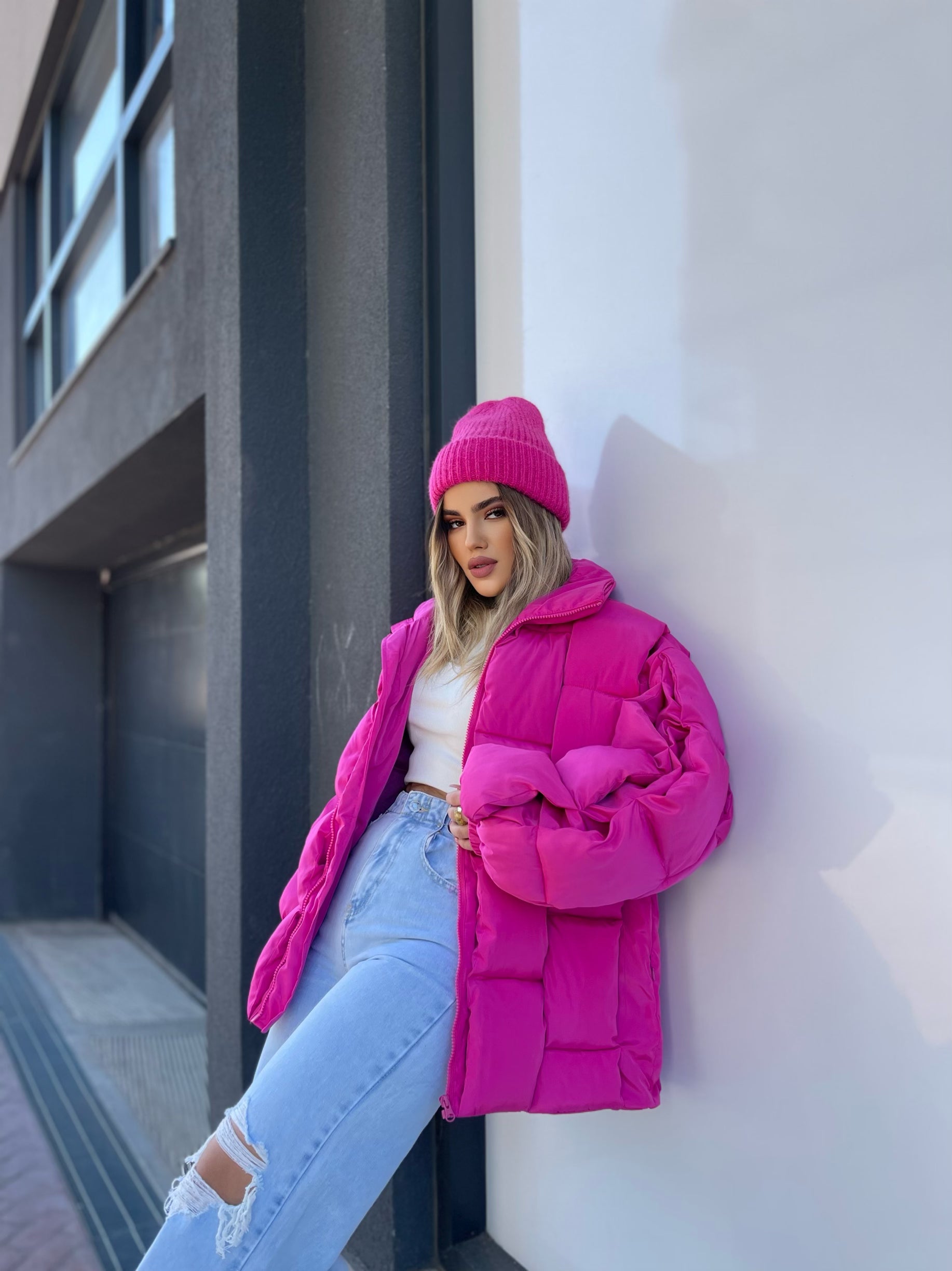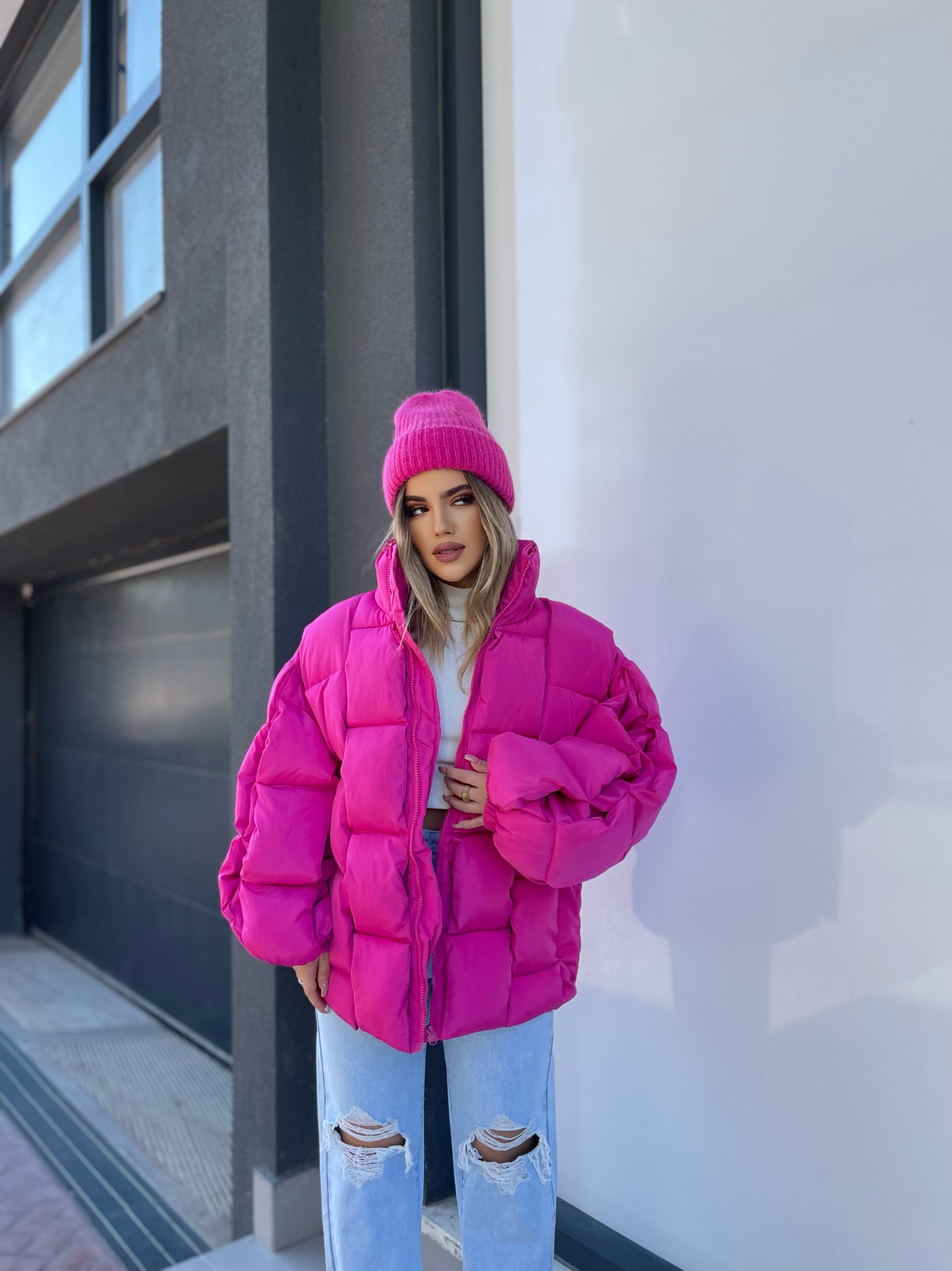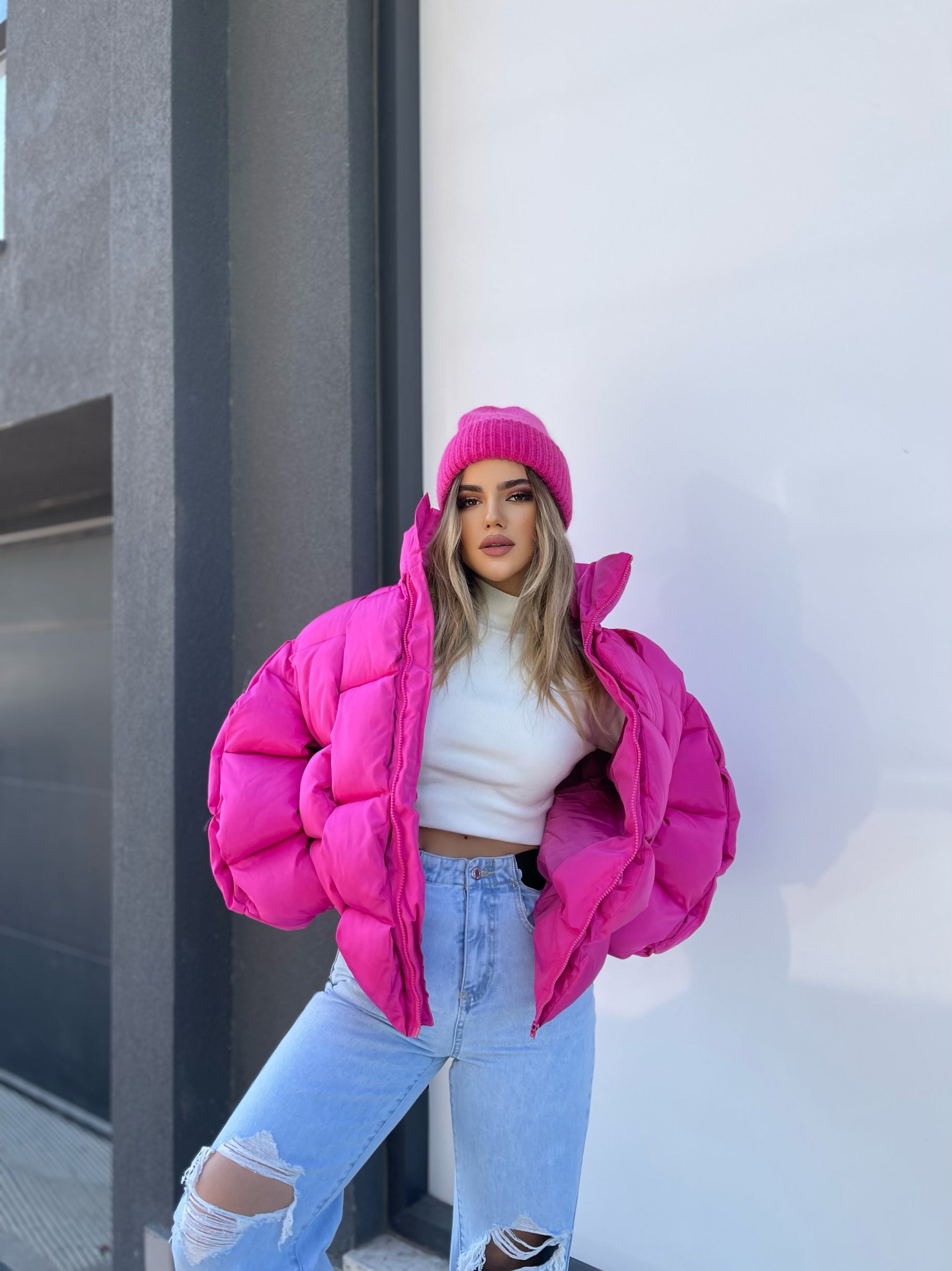 Xhup i shkurter puffer me ndarje te vogla me xhepa anesor. Mberthimi behet me zinxhir ne pjesen e perparme. Jake te madhe dhe me doreza ne fund te mengeve.