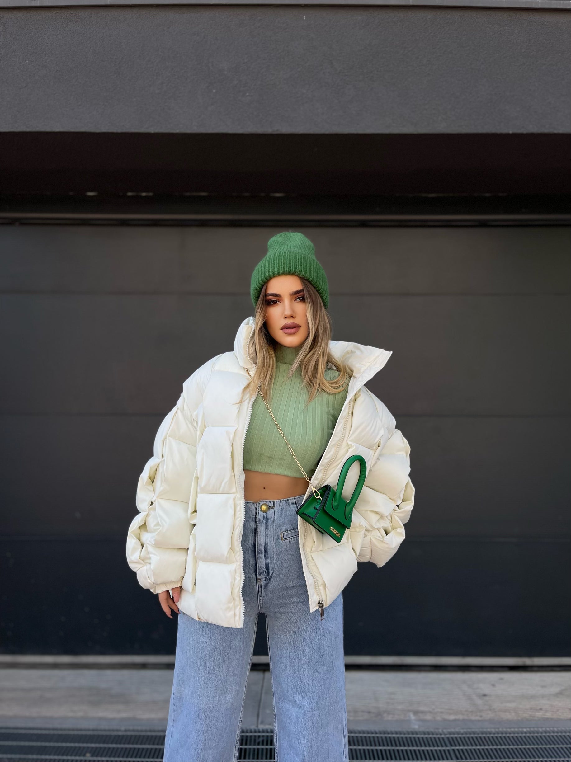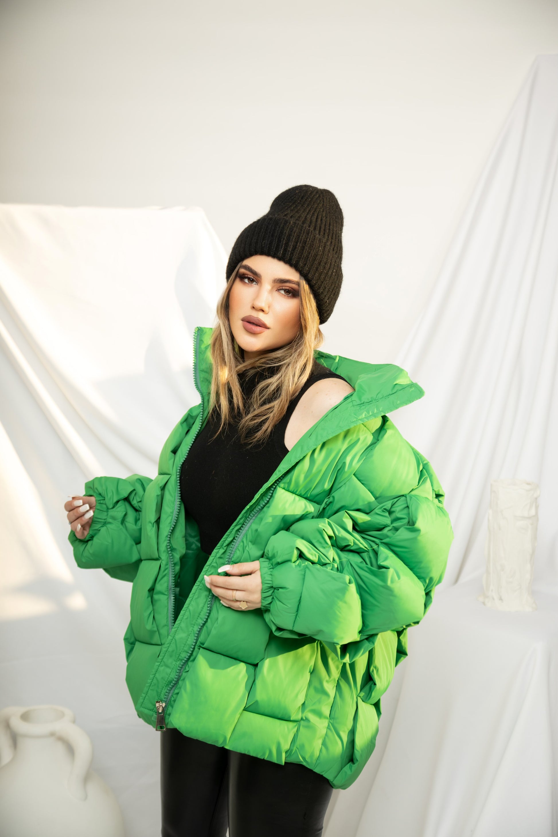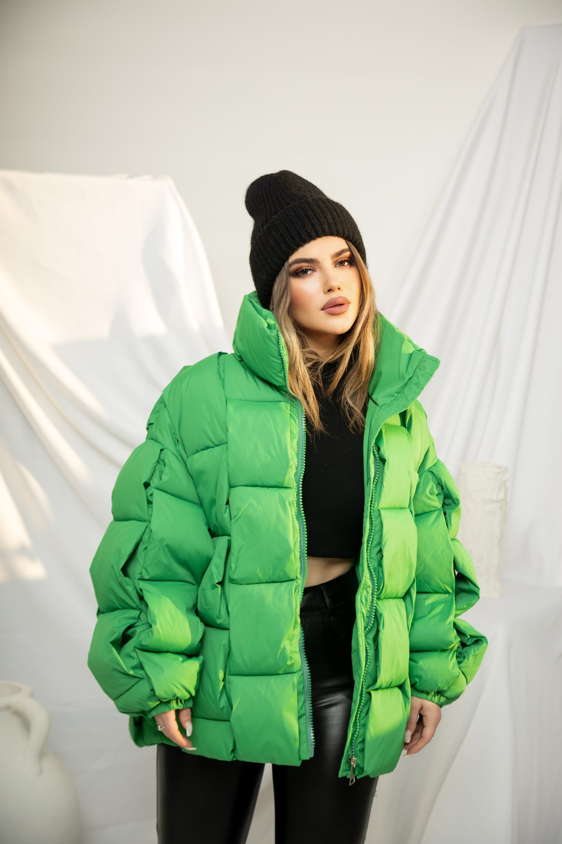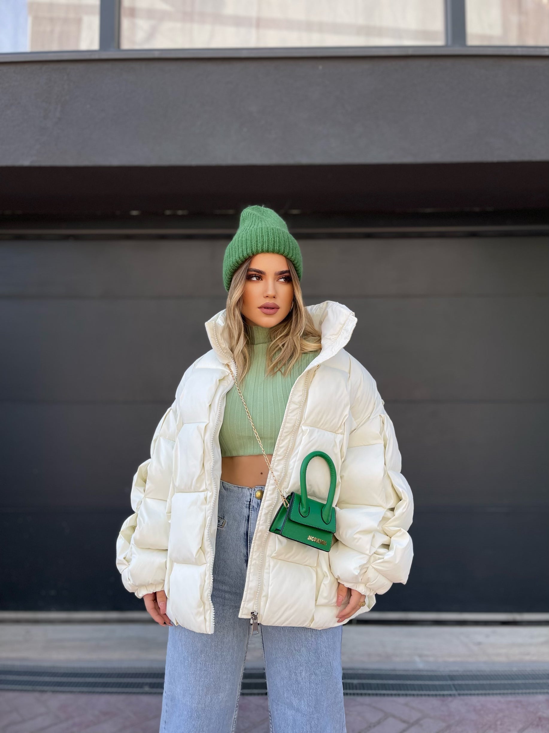 Xhup i shkurter puffer me ndarje te vogla me xhepa anesor. Mberthimi behet me zinxhir ne pjesen e perparme. Jake te madhe dhe me doreza ne fund te mengeve. Modeli vjen ne dy ngjyra:jeshil dhe i bardhe.